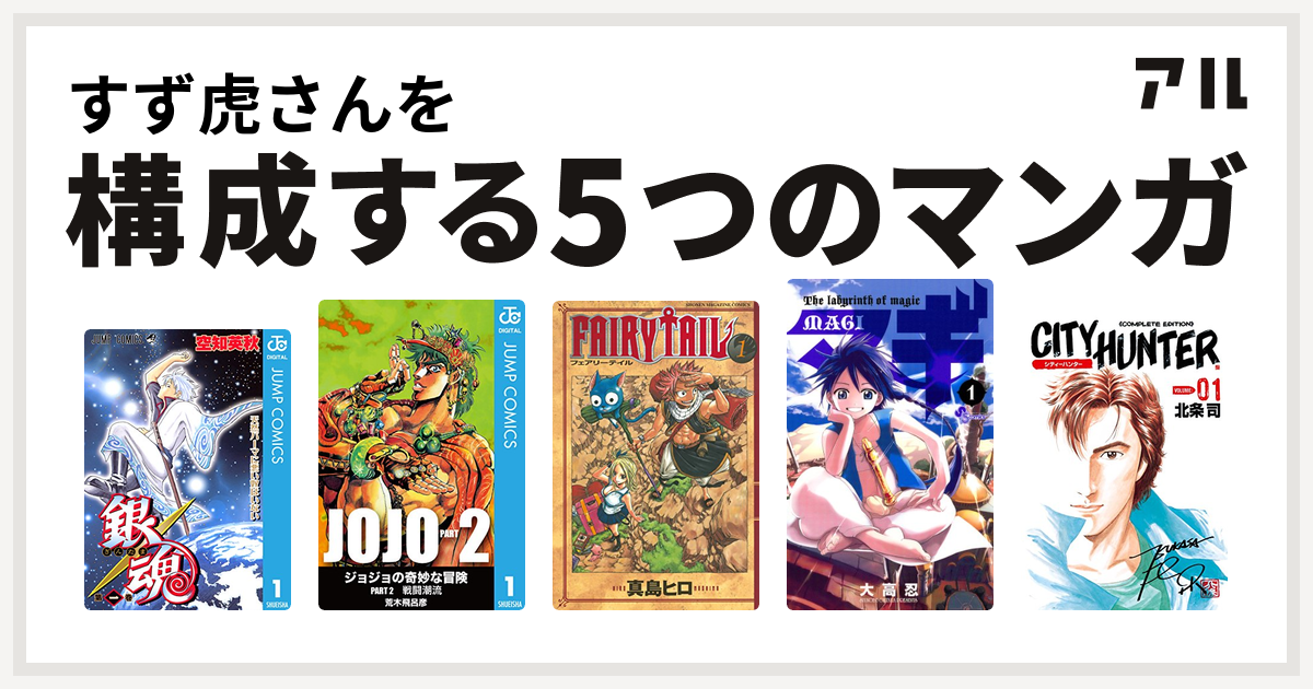 すず虎さんを構成するマンガは銀魂 ジョジョの奇妙な冒険 第2部 Fairy Tail マギ シティーハンター 私を構成する5つのマンガ アル